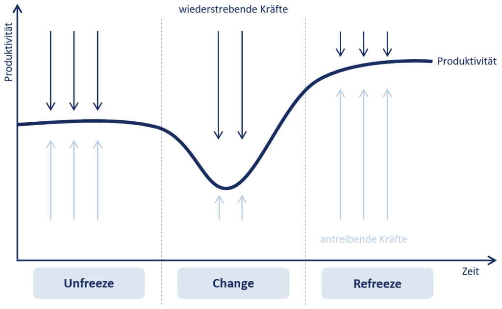 Nach Lewin’s Ansatz gibt es im Change Management oft zwei treibende Kräfte. Auf der einen Seite ist die widerstrebende Kraft, die den Status Quo aufrechterhalten möchte und damit die Veränderungen ablehnt. Auf der anderen Seite steht die antreibende Kraft. Sie will bewohnte Prozesse optimieren und befürwortet die Veränderungen. Wie der Name schon sagt, besteht das 3-Phasen-Modell nach Lewin aus drei Phasen.