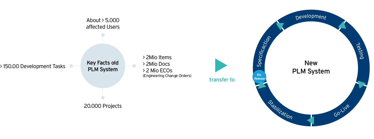 In dem aktuellen Projektauftrag unterstützen wir unseren Kunden dabei, das bestehende Product-Life-Cycle Management (PLM) System, durch ein neues PLM System abzulösen. Aufgrund der enormen Datenbasis kann das aktuelle PLM System nicht mit einem „Big Bang“ ersetzt werden, sondern muss Schritt für Schritt je Unternehmensbereich abgelöst werden.