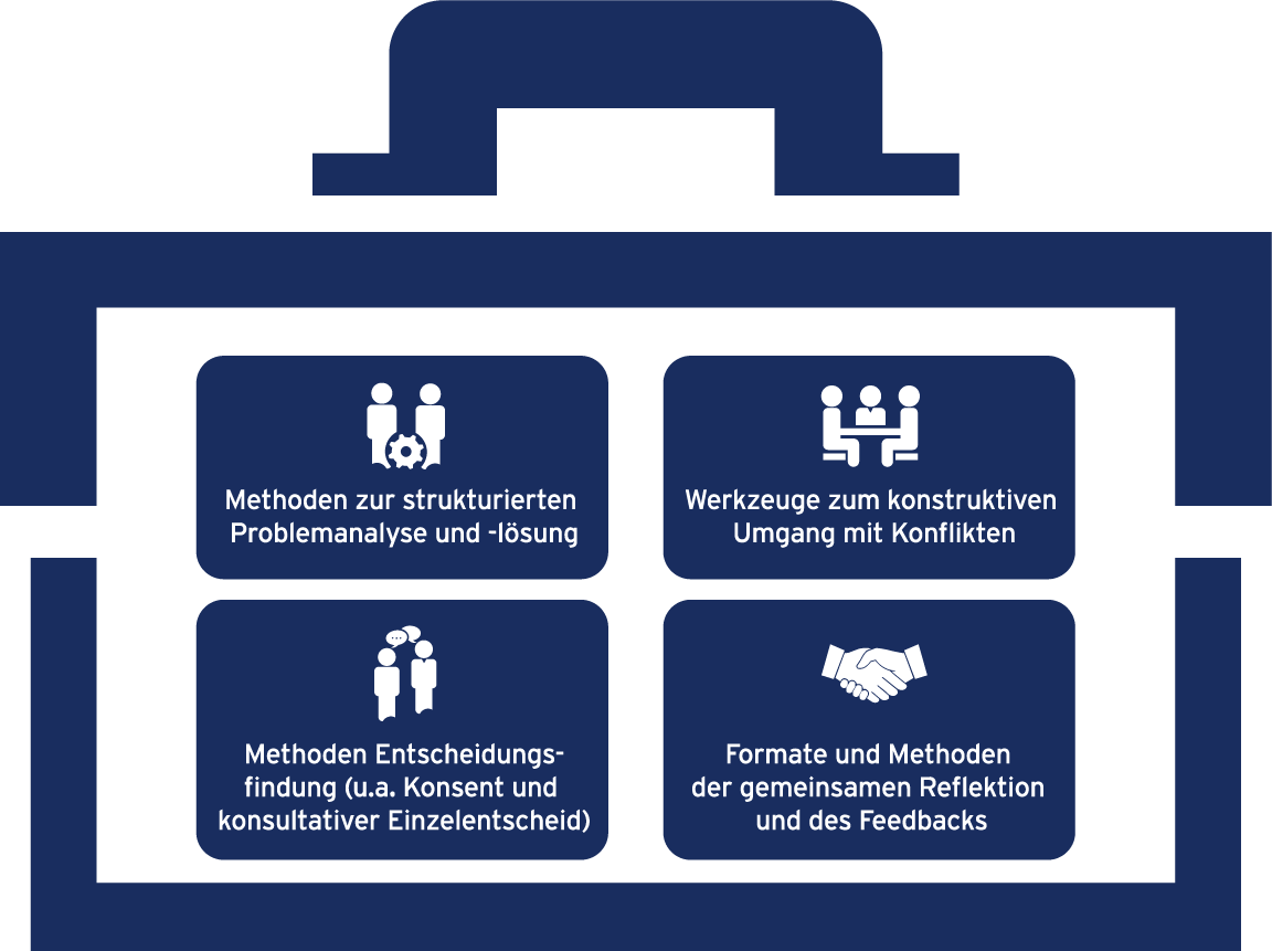 Der Grundsatz, dass konstruktive Freiheiten einen klaren Rahmen benötigen, ist den meisten Organisationen bewusst. In der Konsequenz des Konzeptes benötigen Teams, die sich in einem erweiterten Rahmen selbst organisieren sollen und wollen, einen entsprechenden methodischen Werkzeugkasten, der auf wenigen Prinzipien des Miteinanders aufgebaut ist.