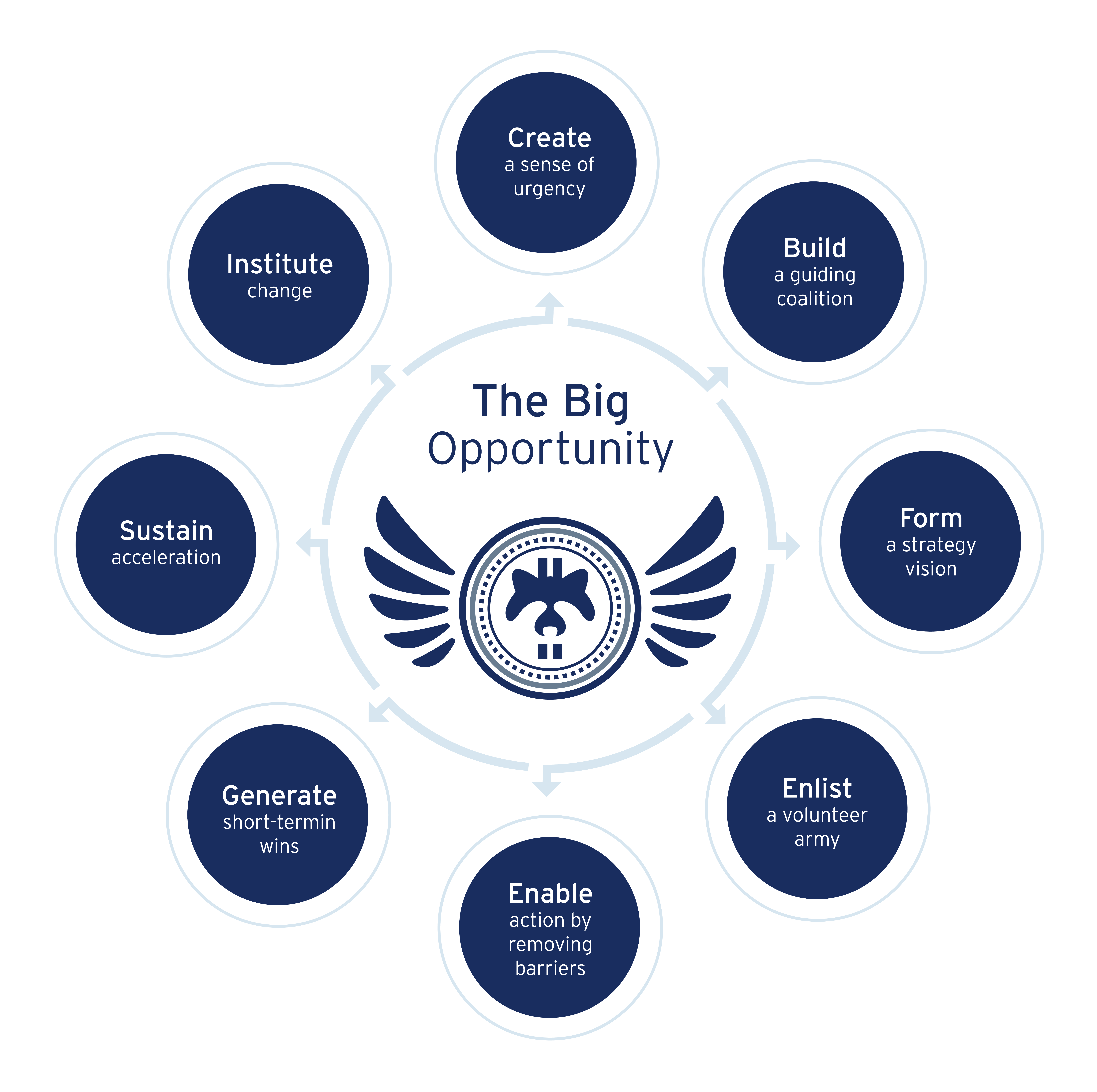 John Kotter, einer der führenden Experten auf dem Gebiet des Change Managements seit den 1980er Jahren, hat als Reaktion auf die hohen Misserfolgsraten bei Veränderungsprojekten einen strukturierten Ansatz entwickelt, um die Erfolgsquote von Veränderungsinitiativen zu erhöhen. Ursprünglich bekannt als das lineare und sequenzielle 8-Stufen-Modell, entwickelte Kotter aufgrund von erhöhtem Volumen und gestiegener Geschwindigkeit des Wandels seinen Ansatz weiter zu den 8 Beschleunigern – einem zyklischen, iterativen, dynamischen und flexiblen Modell (siehe Abb. 1).