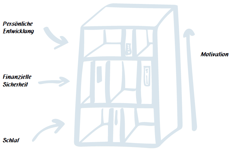 Wie diese Werte unsere Motivation und damit unser Handeln bestimmen beschreibt das Bücherregal der Erkenntnisse (siehe Abb. 2). In unserer Gesellschaft ist es eine gängige Annahme, dass unser Handeln rational getrieben ist. Als rationale Denker entscheiden wir unseren nächsten Schritt aufgrund vorliegender Fakten und erwarteter Ergebnisse. Emotionen lenken uns dabei lediglich vom Weg ab und verleiten uns, anders zu handeln. Manson stellt diese Annahme in Frage. Denn auch das rationale Handeln hat einen Antrieb: Einen Gedanken oder eine Erkenntnis, die uns wichtig erscheint. Was wichtiger ist, entscheiden dabei unsere persönlichen Werte und die mit ihnen verknüpften Emotion. Wenn ich mich morgens um sechs Uhr mühselig aus dem Bett quäle, steht dem entgegen nicht der rationale Gedanke zur Arbeit gehen zu müssen, sondern ein Bedürfnis nach finanzieller Sicherheit und dem Gefühl mein Leben mit dem verdienten Geld unabhängig gestalten zu können. Verlasse ich die finanzielle Sicherheit meines Jobs für eine neue Stelle, ist ein möglicher Antrieb, mich als Person in eine neue Richtung zu entwickeln. Grundlage für diese Hierarchie sind die Erfahrungen, die ich im Laufe meines Lebens sammle und die Emotion, die ich mit ihnen verknüpfe (Manson & Wayne, 2019:55-57).