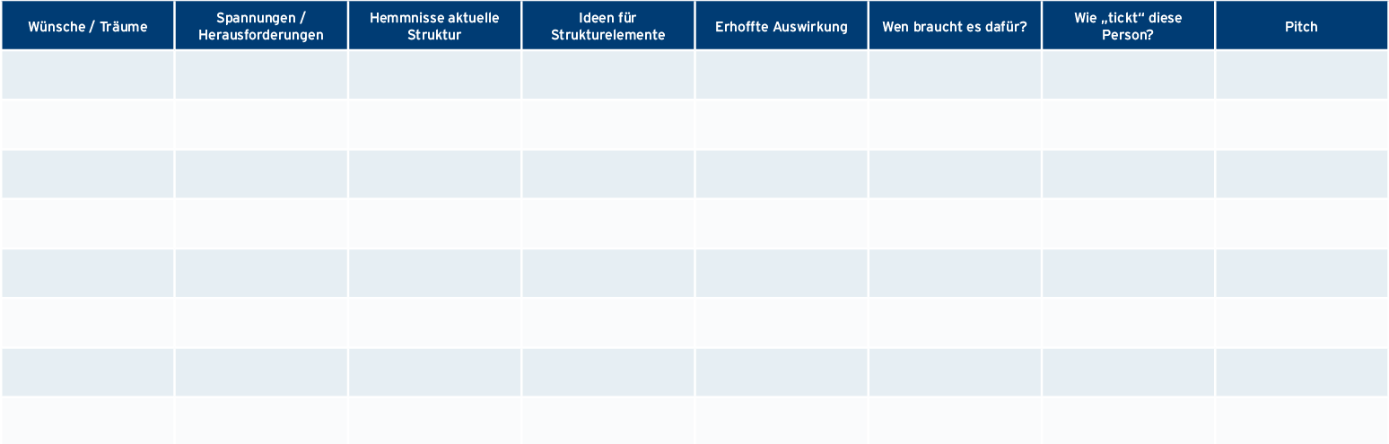 Der Fokus wird nun auf die Struktur gelegt: Welche aktuellen strukturellen Gegebenheiten sorgen für die wahrgenommenen Spannungen und führen damit durch Wechselwirkungen zum unerwünschten eigenen Ausbremsen? (vgl. Beispiele oben)